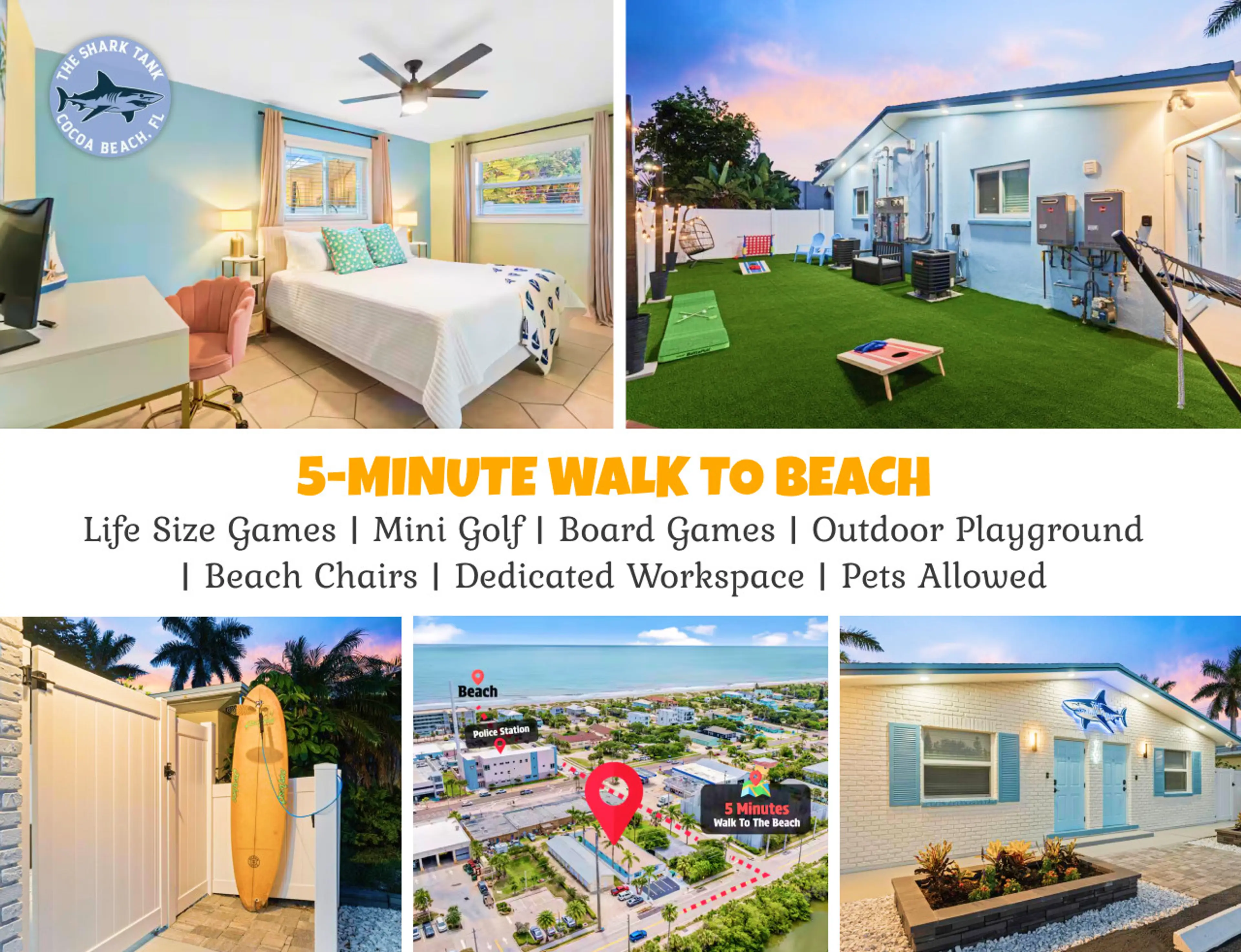 Welcome to The Shark Tank, the ultimate Cocoa Beach getaway! Just 2 blocks (5 min walk) from the beach & downtown, our newly renovated apartment offers all you need for an unforgettable Florida experience. - Walk to beach, bars, restaurants - 75' TV - YouTube TV + NFL Sunday Ticket included - 2 Bea...